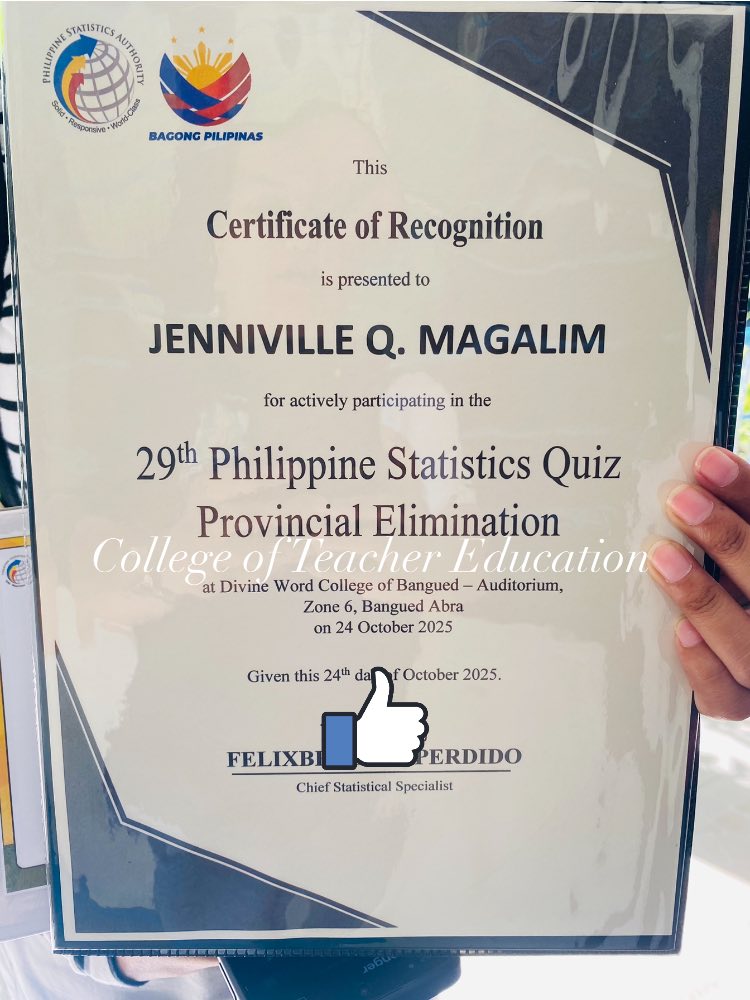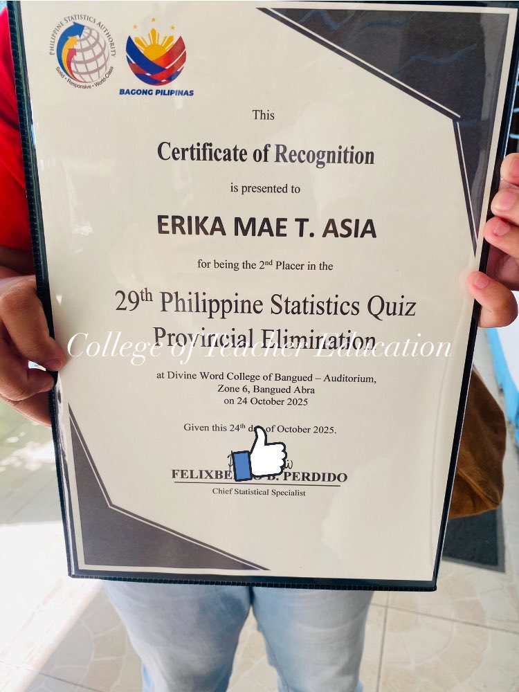 With her outstanding performance, Erika Mae T. Asia earned the honor to represent the Province of Abra in the upcoming Regional Elimination of the 29th Philippine Statistics Quiz to be held on November 6, 2025, in Baguio City, alongside the first placer from Divine Word College of Bangued.